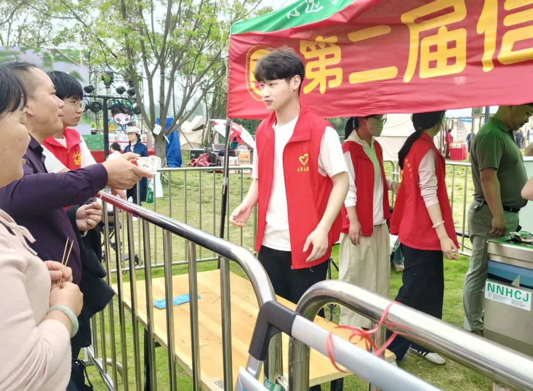 为使第二届信阳菜“美食七天乐”活动顺利举办,tyc7111cc太阳成集团克服种种困难,精心选派48名学生志愿者分三组全程提供活动服务。他们不惧雨水、炎热、劳累,热情、细心、周到地为活动、为市民、为游客提供着全方位的志愿服务。