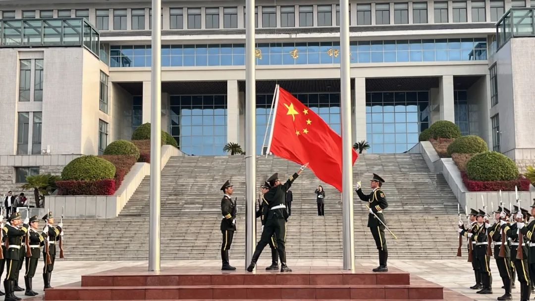 晨曦中,英姿飒爽的国旗护卫队队员们迈着整齐步伐,护送国旗入场。伴随着国歌的奏响,主旗手用力扬起国旗,全体师生向国旗行注目礼,齐声高唱国歌,嘹亮的歌声在校园上空回荡,以表达对伟大祖国的热爱和对革命先烈的缅怀。鲜艳的五星红旗在师生的注视下缓缓升起。