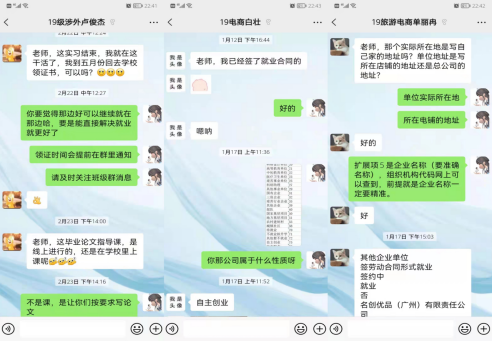 一方面确保就业信息充分供给,并根据行业、地域等关键要素分类,将就业信息精准供给不同学生群体。无论何时何地学工队伍老师们一直陪伴在左右,为毕业生们保驾护航,安全感满满。