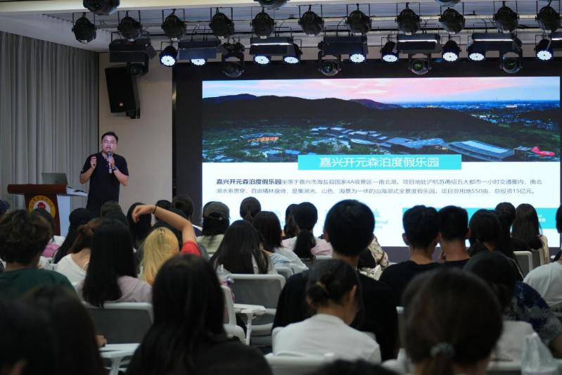 张帆校友2020年毕业于我院酒店管理专业,并入职莫干山开元森泊度假乐园。五年间,他扎根行业、持续成长,积累了丰富的实战与管理经验。讲座中,他结合个人职业路径,围绕旅游行业现状、岗位发展通道及未来趋势等方面展开生动讲述,并通过介绍开元森泊在全国的多个项目,为同学们展现了旅游业广阔的就业前景与发展空间。