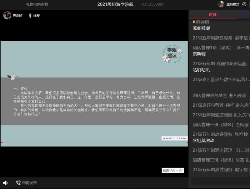 学长学姐们用自己的亲身经历,鼓励“小21们”在大学中刻苦学习,学好专业技能,提升综合素质,积极参加学校举行的各种活动,珍惜“学生”的身份,不辜负大学三年的美好时光。