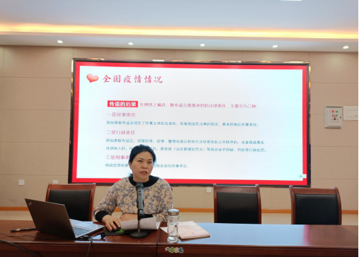 张书记首先梳理了全国疫情防控的总体情况,并从奥密克戎病毒的感染症状和传播性,总结了预防奥密克戎病毒的要点,对个人防护提出了“十八字”要求。她指出,面对疫情,我们要学会理智分析,不传谣、不信谣,认真做好日常疫情防控和教育教学工作。最后,公布了学院疫情防控监测工作流程以及感染病毒后的应急处置方案,让全体老师更加熟悉并重视疫情防控工作。