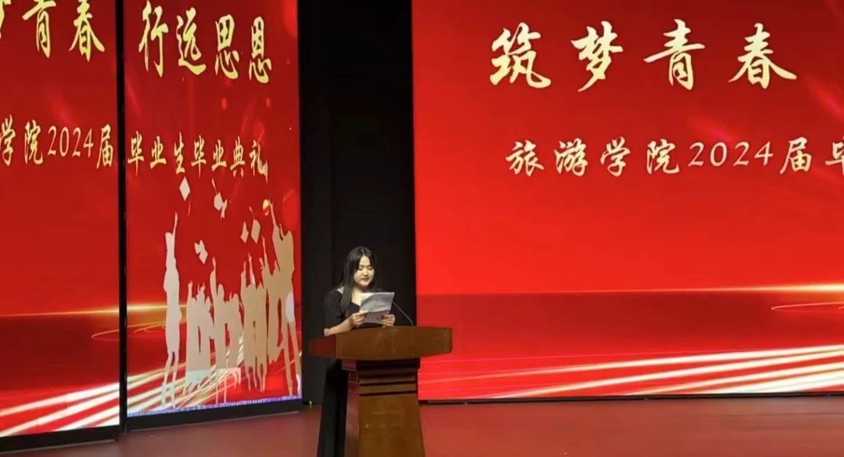 21级烹饪工艺与营养班程文一作为毕业生代表发言。发言中她对自己的大学生活进行了全面的总结,提醒旅游学子们要珍惜大学时光,不负青春韶华!