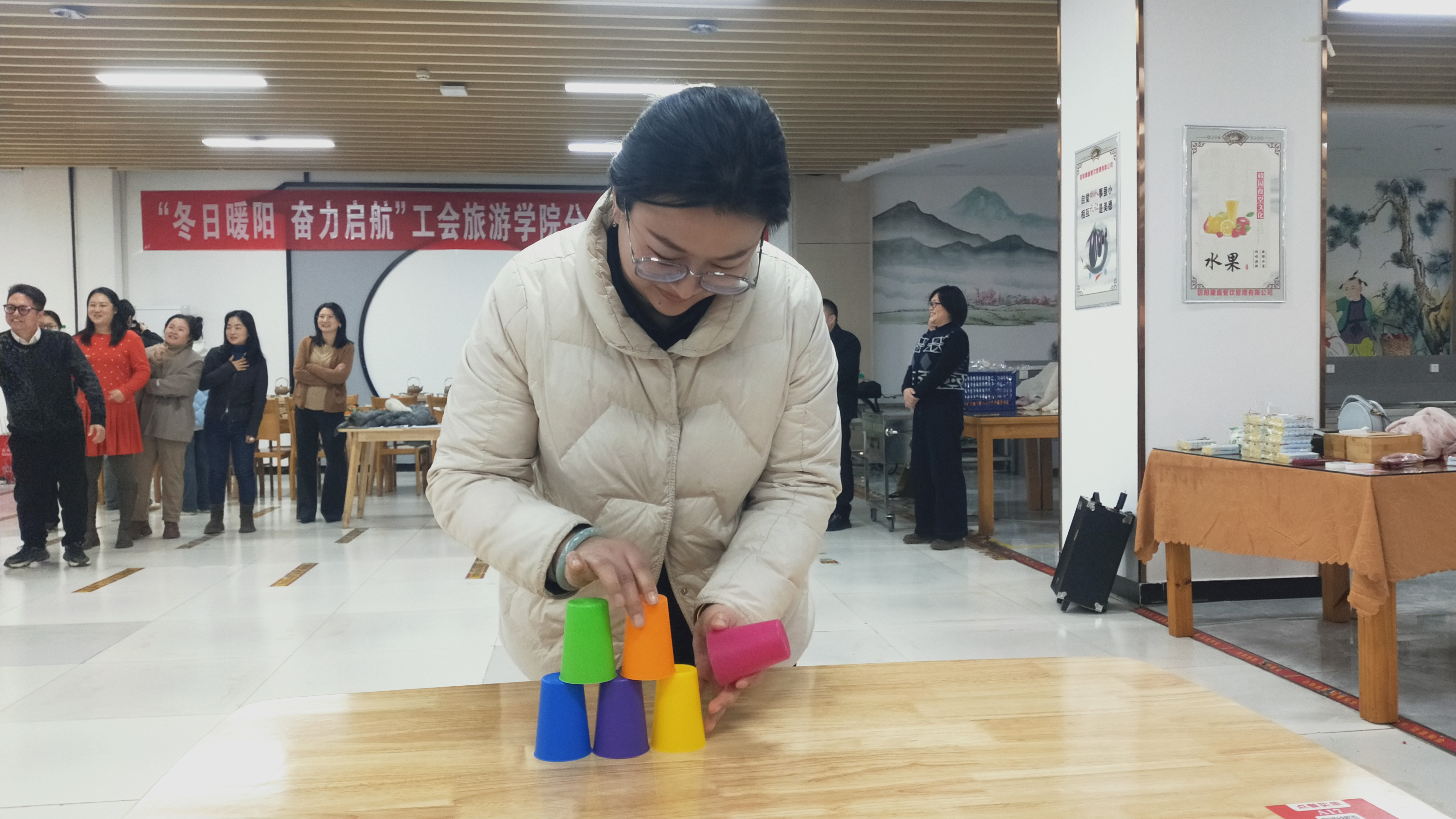 叠杯子环节,大家屏气凝神,双手飞快操作,迅速地将杯子叠成指定形状又还原,紧张又刺激。