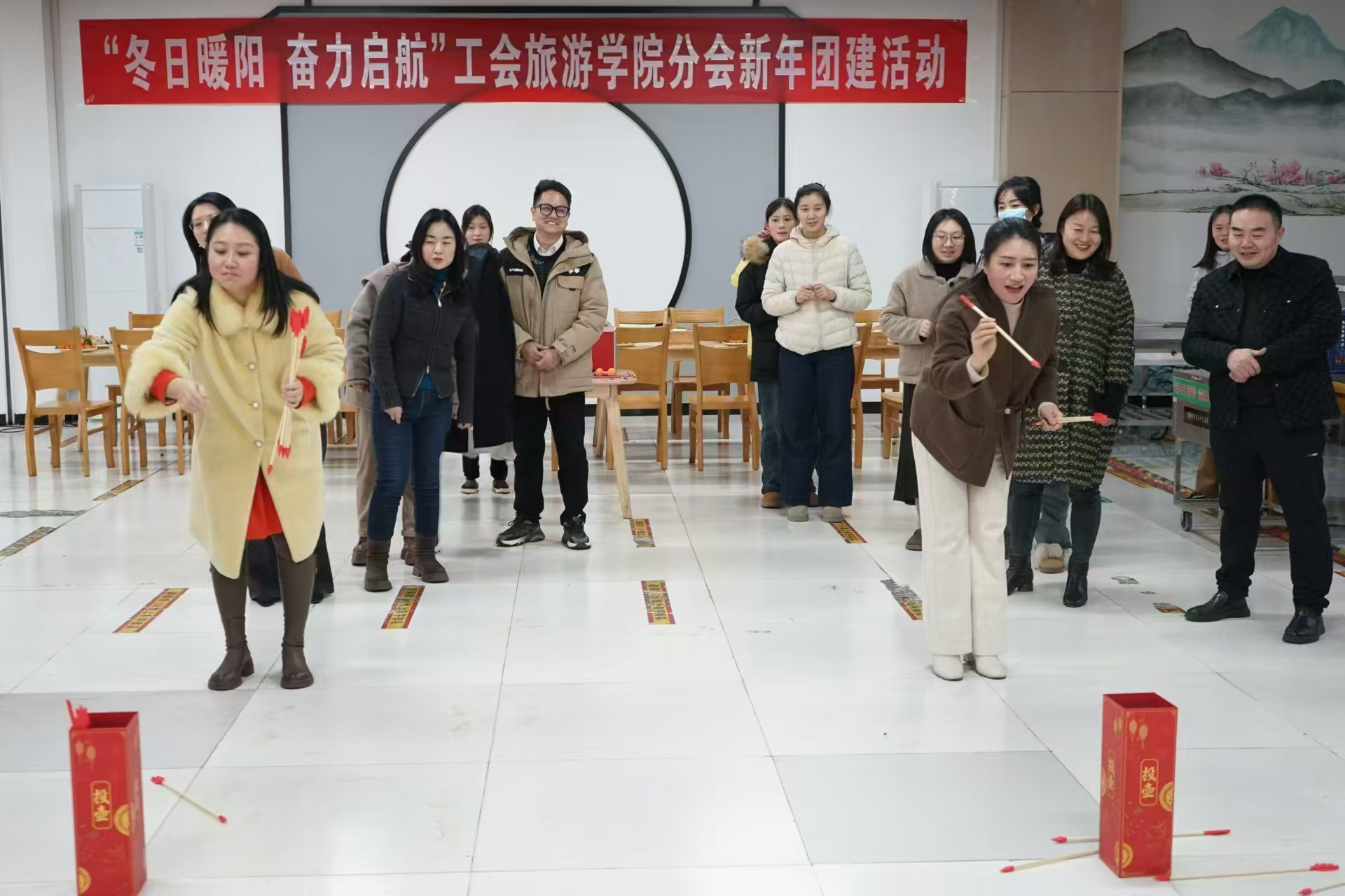 投壶游戏中,教职工们需要精准地将箭矢投入壶中,这不仅考验了他们的手眼协调能力,还激发了大家的竞争意识和团队合作精神。
