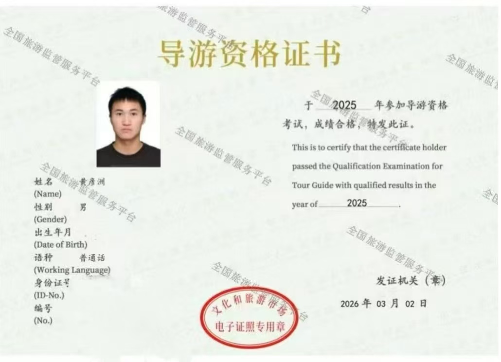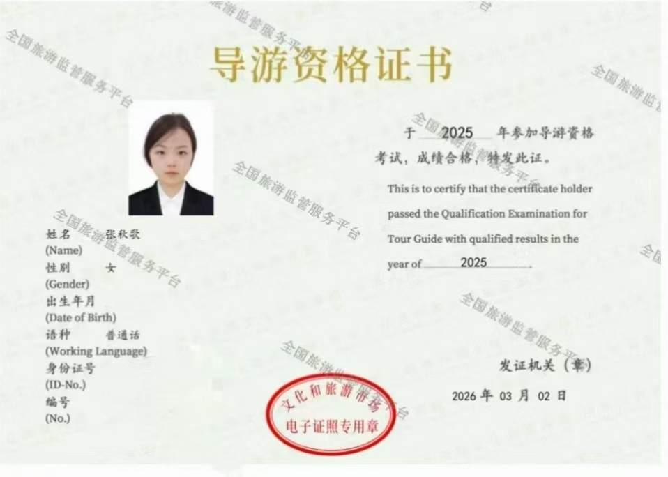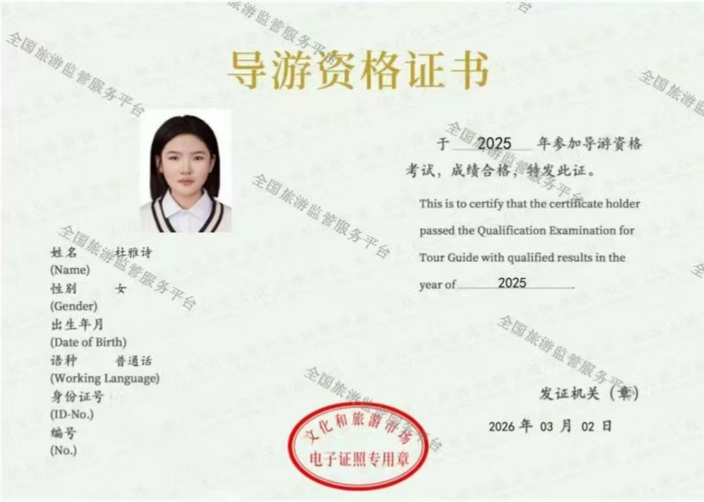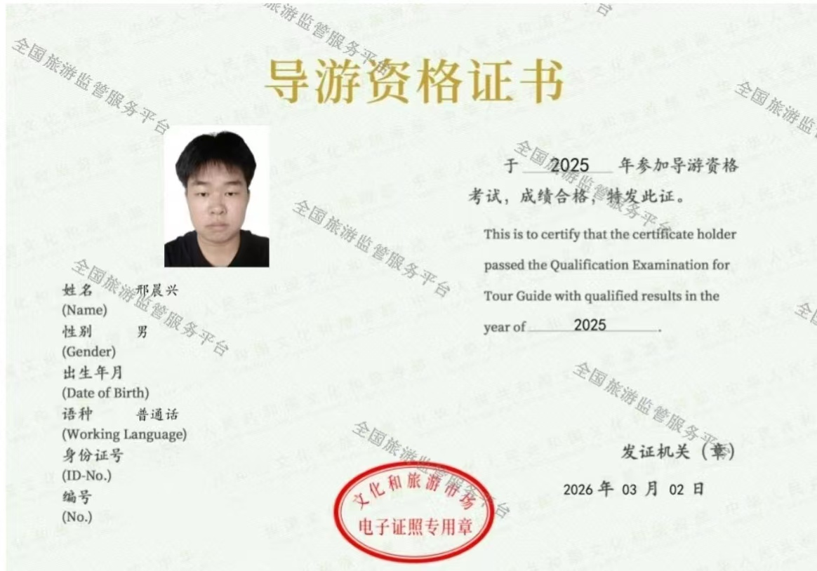 春风送暖,捷报传来。近日,2025年度全国导游资格证书考试成绩正式揭晓,我院22级旅游管理专业的程澜和24级的韩自强、邢晨兴、杜雅诗、黄彦洲、张秋歌等六位同学成功拿到了梦寐以求的“国导证”,这也是tyc7111cc太阳成集团在2023年1人、2024年3人后再创的佳绩。