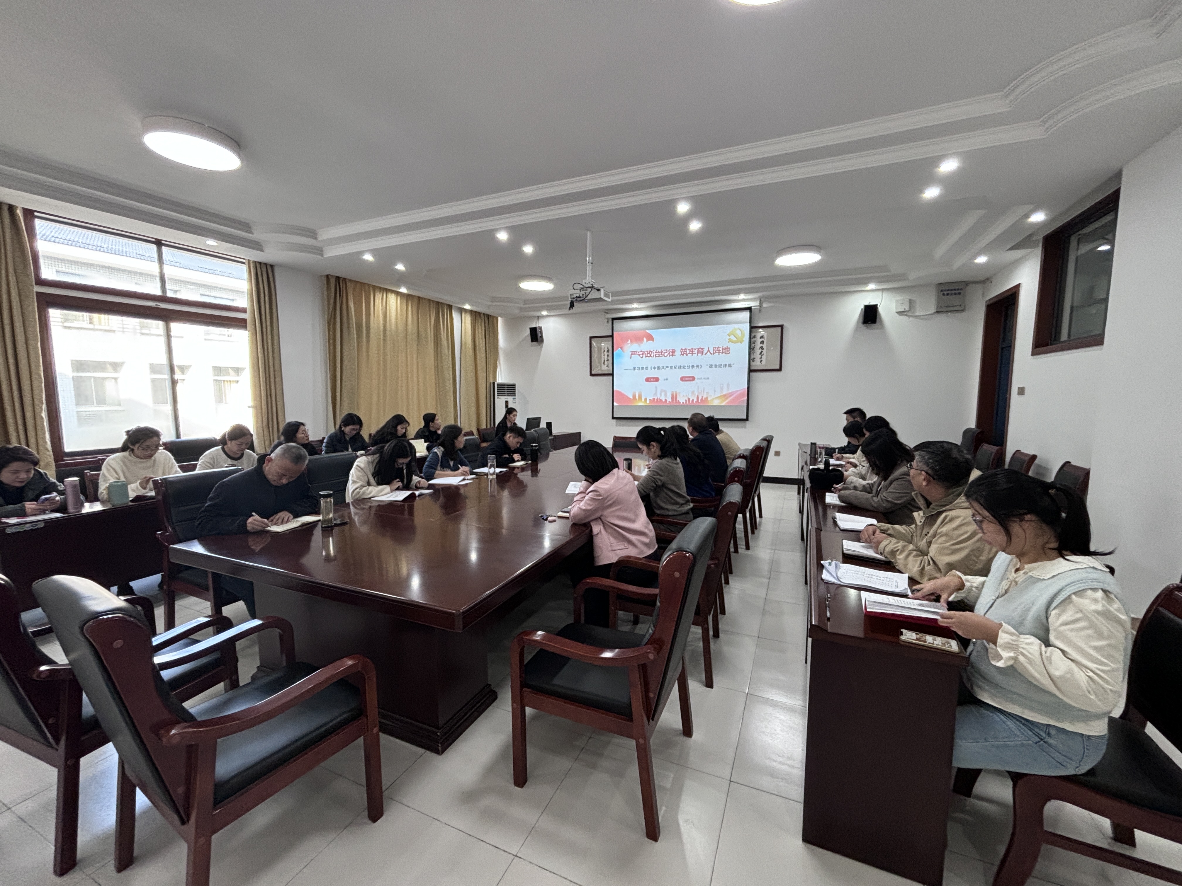 党课紧密结合《中国共产党纪律处分条例》第六章相关内容,通过理论领学、案例剖析与当前社会热点辨析相结合的方式,深入阐释了政治纪律的核心要义与实践要求。王璐书记重点讲解了在复杂意识形态形势下,党员教师如何保持政治清醒、坚守育人初心,并强调要将纪律要求有机融入教育教学全过程,引导学生明辨是非、坚定理想信念。最后,王璐书记还要求全体党员教师会后对照所学条款开展十分钟政治体检,反思个人言行,并将政治纪律要求内化为备课、授课和与学生互动的自觉准则,让严守政治纪律成为教育工作者不可或缺的职业习惯与素养。