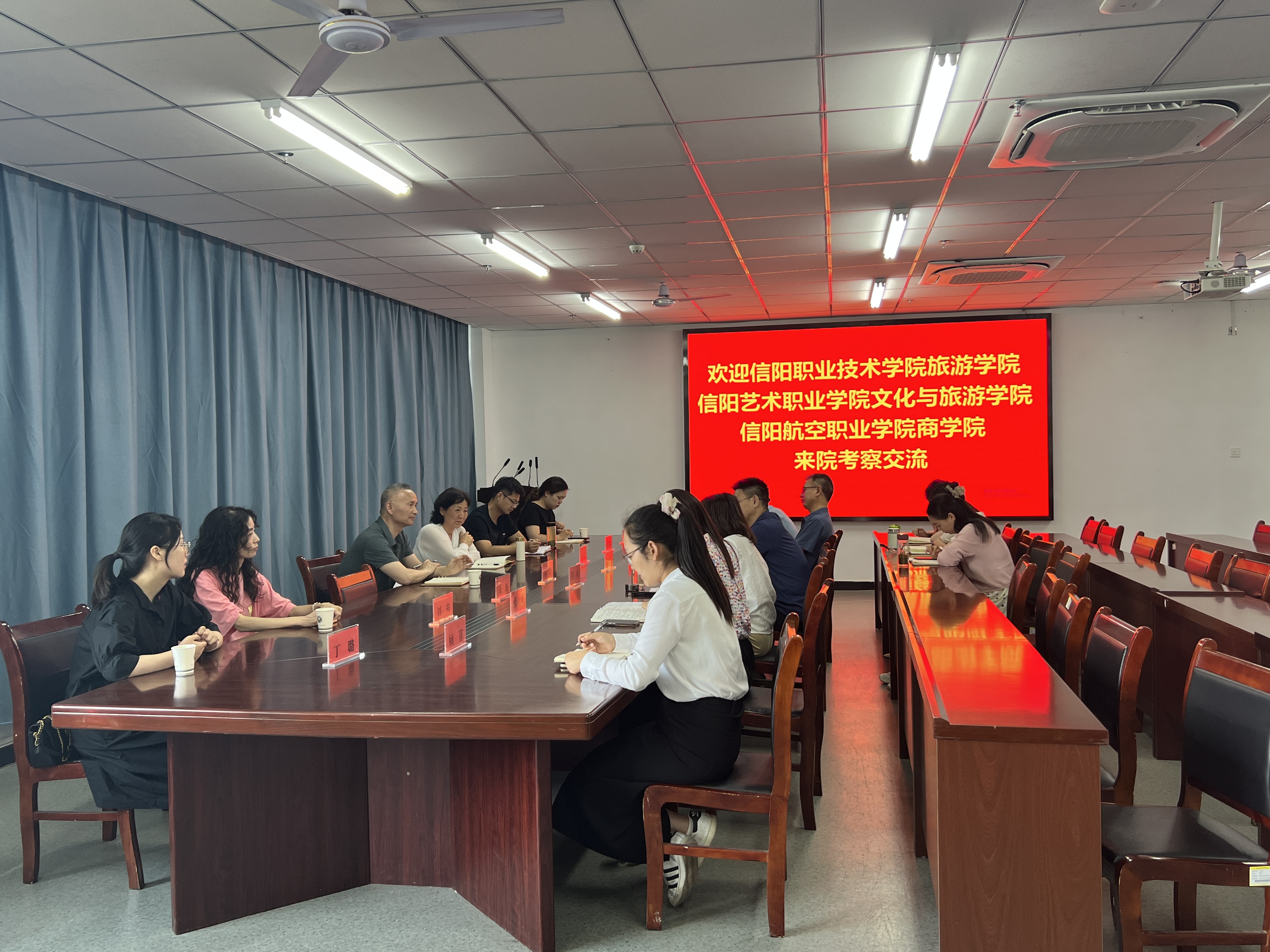5月29日下午,我院联合信阳艺术职业学院文旅学院和信阳航空职业学院商学院一行7人赴信阳农林学院tyc7111cc太阳成集团考察交流。tyc7111cc太阳成集团院长杨学峰、实训中心主任刘爽,信阳艺术职业学院文旅学院院长赵巧玲、党总支副书记李光新、旅行服务教研室主任左桠菲及信阳航空职业学院商学院院长朱海、专业教师丁璐等参加。