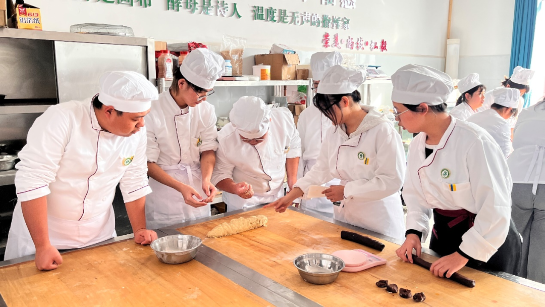 在实操练习环节打破校际界限,两校学生混合分组,围绕所学内容开展菜品与糕点制作。在双方教师的现场指导下,学生们相互协作、切磋技艺,在实践交流中提升专业技能。