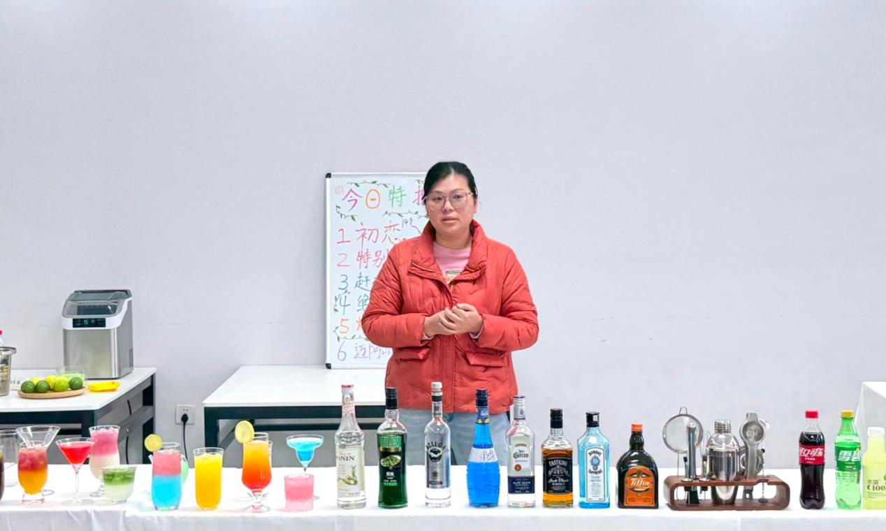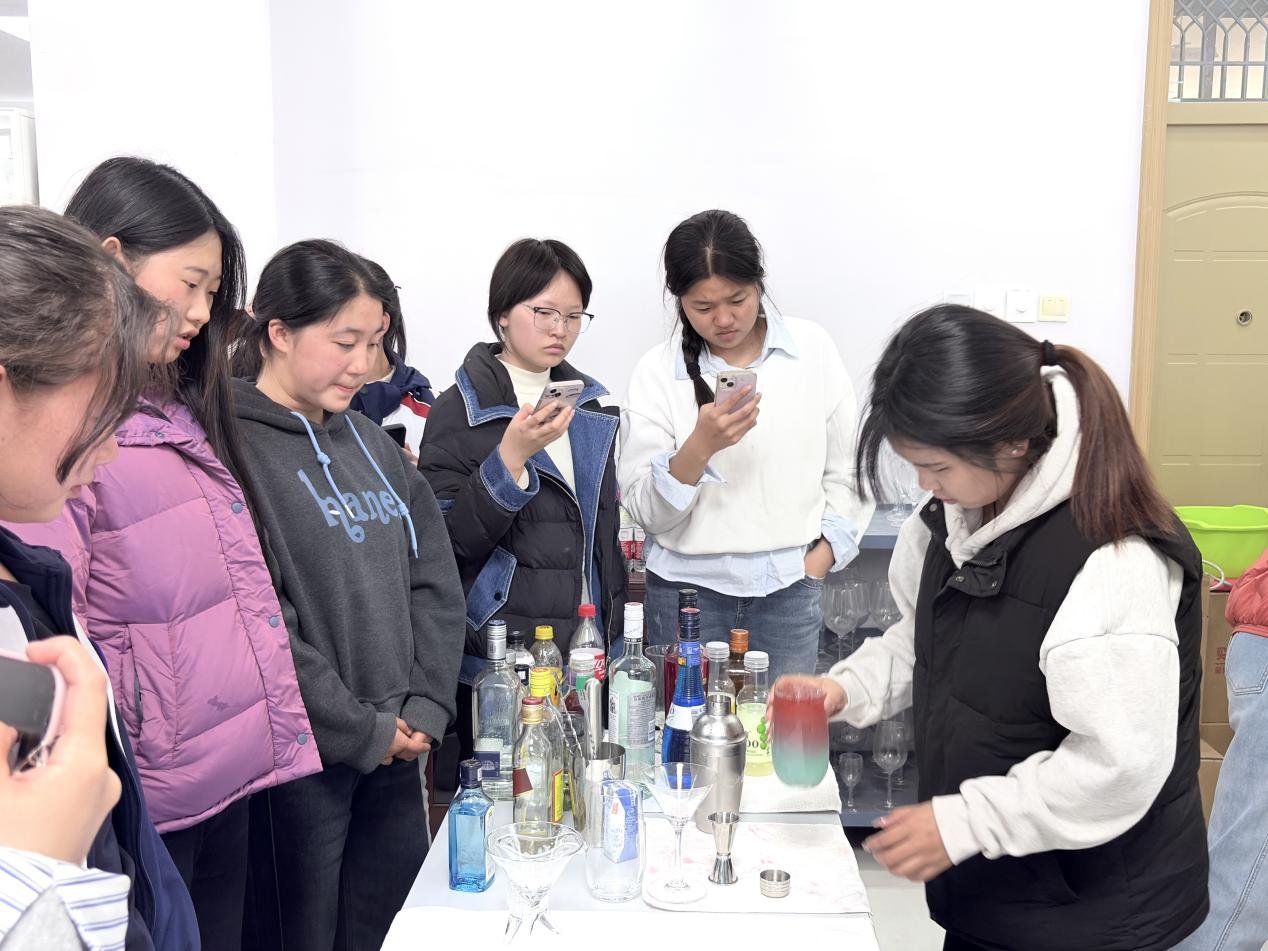 在酒店实训室,酒店教研室主任刘孝娟现场演示鸡尾酒调制技艺,从摇壶手法到分层创意,将服务美学与地方文化巧妙融合。学生亲身体验调酒流程,在杯中艺术里感知酒店管理的专业魅力。