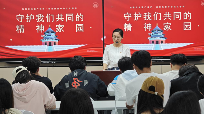第六课由翟娟老师讲授,翟老师号召同学们保护文化遗产,作为新时代新青年应该守好文化根基,讲好中国故事,铸就中华民族伟大复兴。