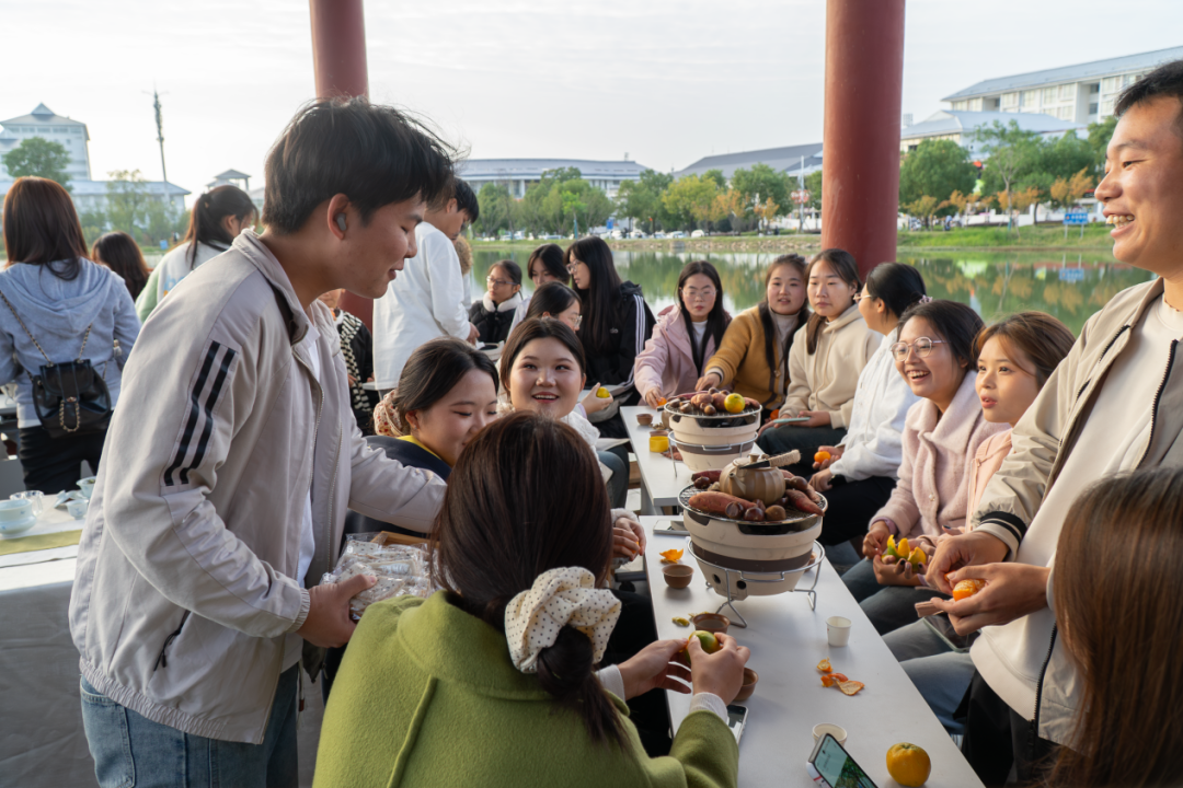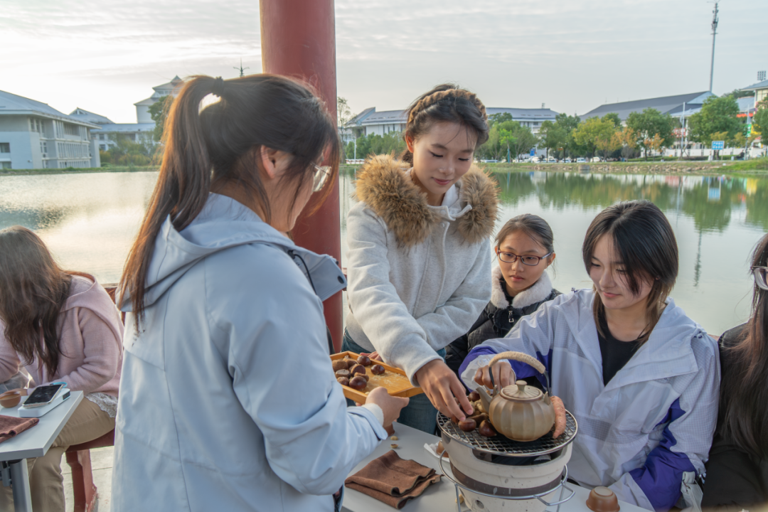 陶炉星火初红,砂铫松风渐起。老白茶的醇厚与滇红的蜜韵在茶寮中交融升腾,配以新焙的糖炒栗子与手作桂花糕,正是“一盏清茗酬知音,四时佳兴与人同”的生动写照。师生围坐,执盏品茗,在氤氲茶烟中感受时令风物的馈赠。