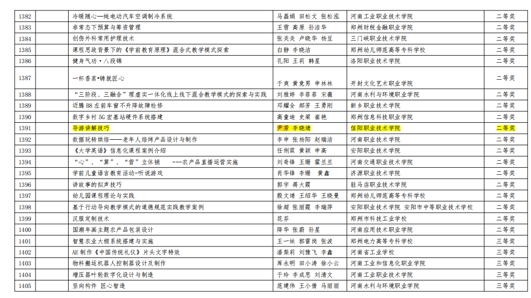 根据《河南省教育厅办公室关于举办河南省第二十七届教育教学信息化交流活动的通知》(教办资2023) 120号),我院教师刘欢报送的《河南省基本概况与主要文旅资源》课件,在职业教育组课件评比中获得一等奖;我院副院长尹芳和教研室主任李晓靖共同报送的《导游讲解技巧》教学案例,在职业教育组信息化教学课程案例评比中获得二等奖。
